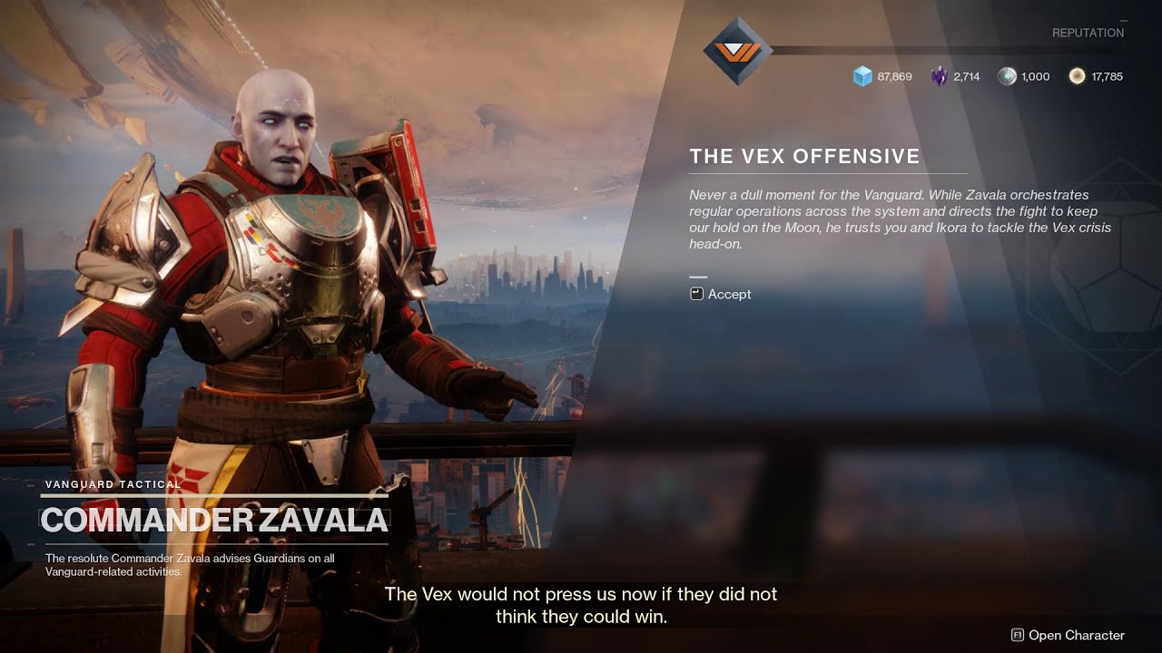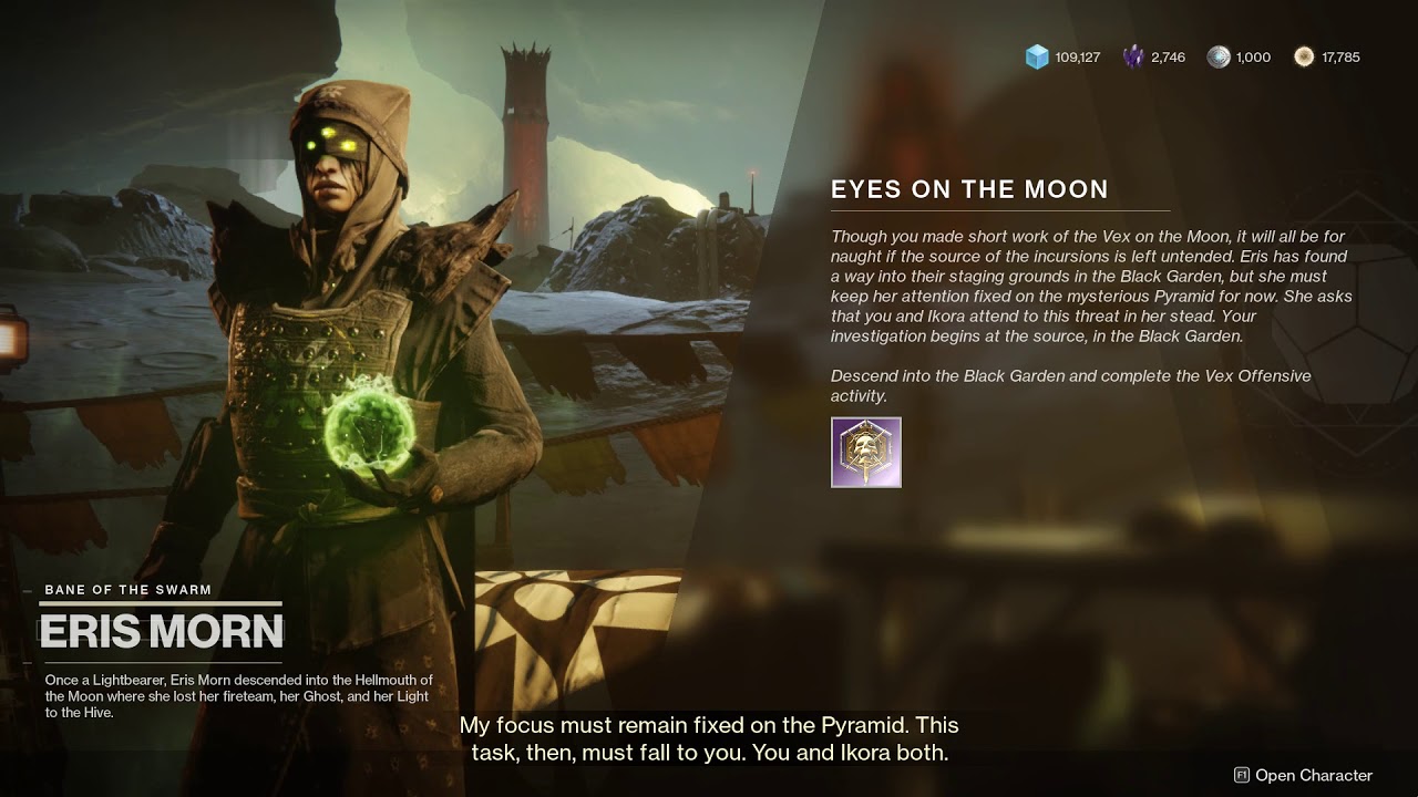 After the Guardian returned from the Pyramid, Vex began flooding the Moon, drawn there by the Pyramid.32 Morn found a way into the Black Garden, but since she was already occupied by the study of the Pyramid, she recommended that Rey and the Guardian work to stop the Vex invasion.33