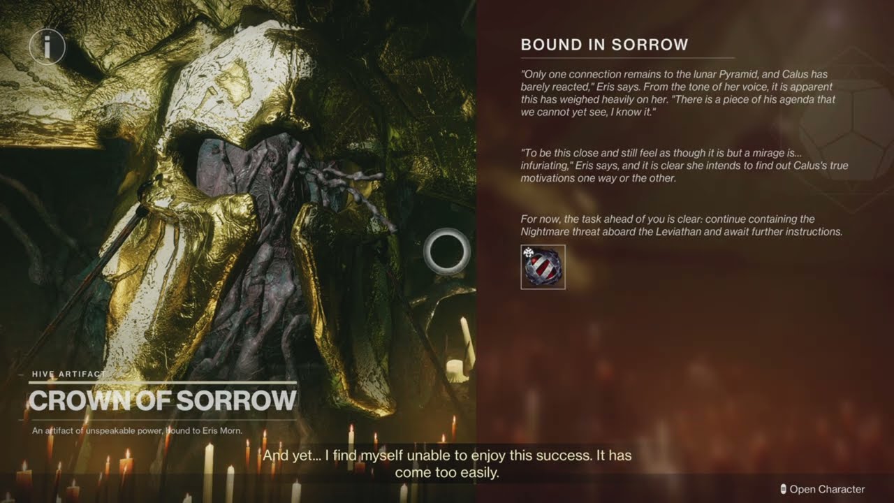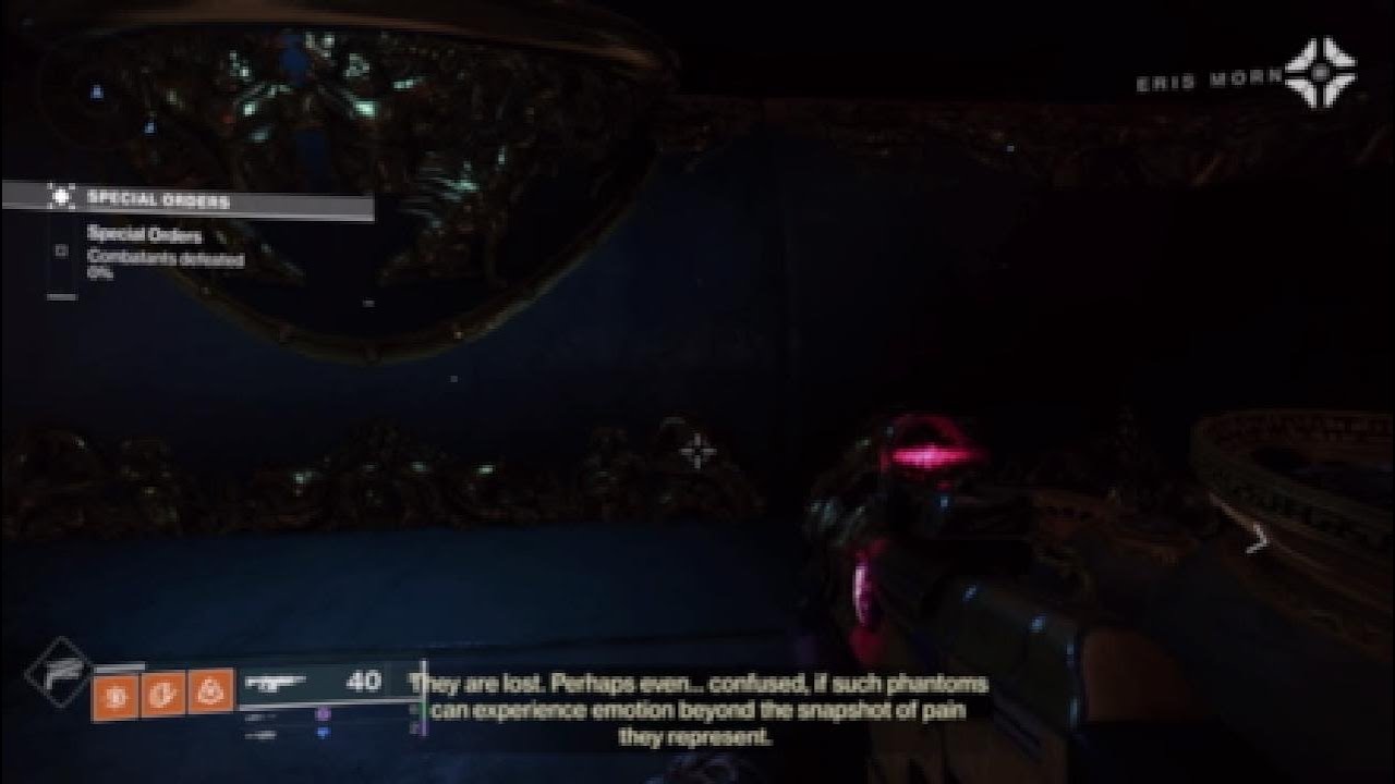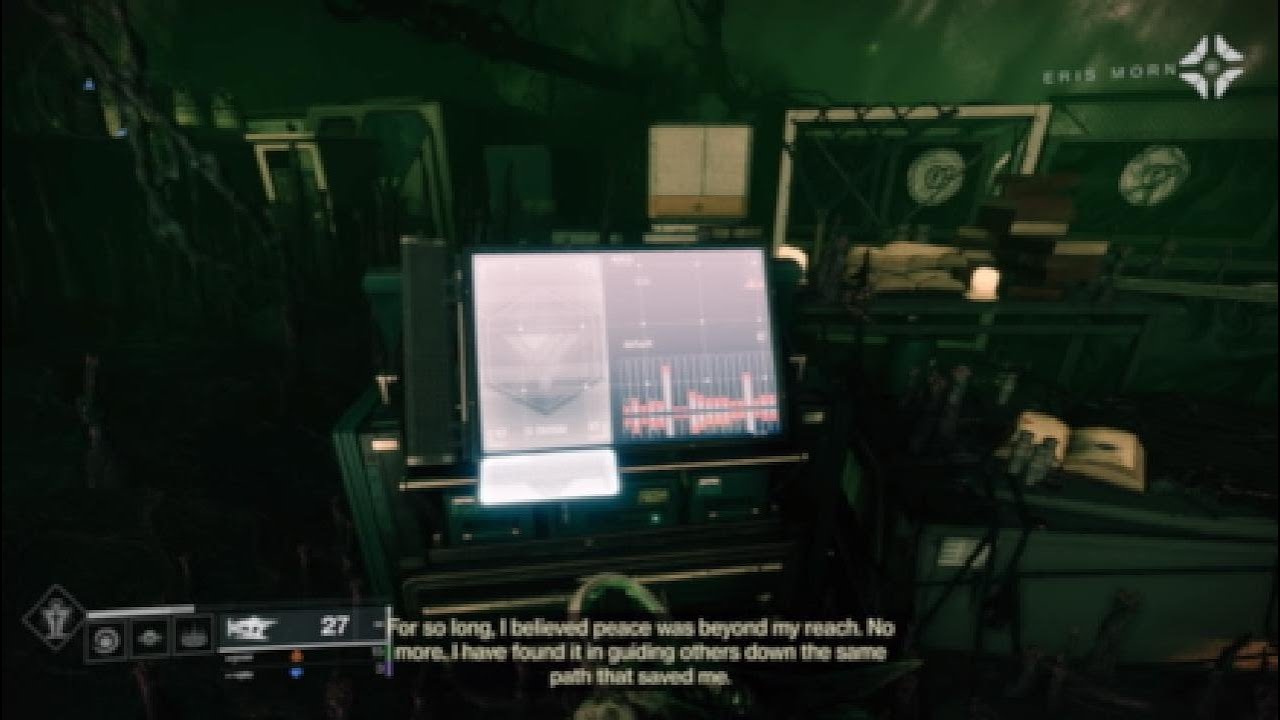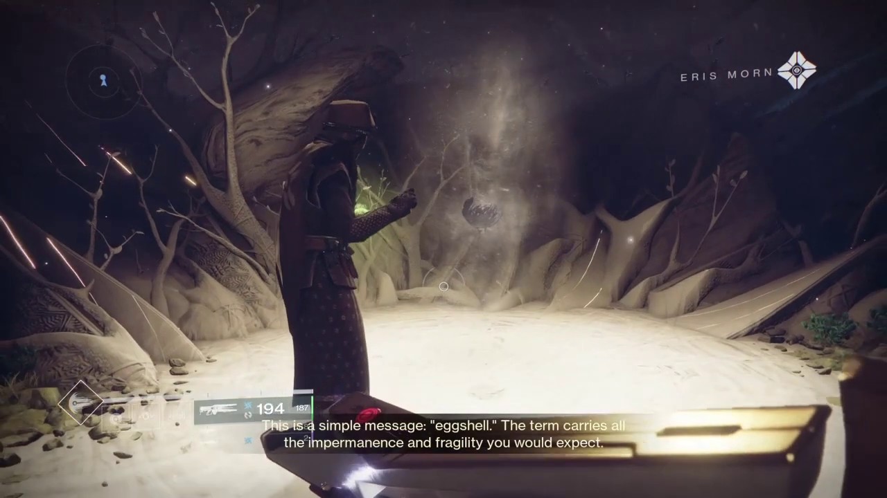 Eris participated in the Great Ahamkara Hunt alongside Guardians such as Wei Ning, Commander Zavala, and Lord Shaxx.34 During the Hunt, Morn wrote to Queen Mara Sov advising her that Ahamkara may flee to Awoken territory to escape slaughter; she encouraged Sov to kill them on sight.5 At some point, Morn came into the possession of an Ahamkara bone.6