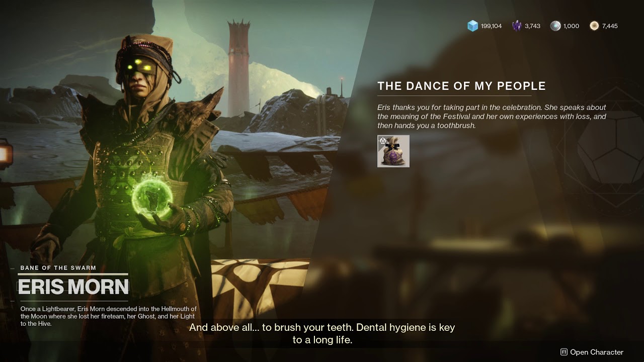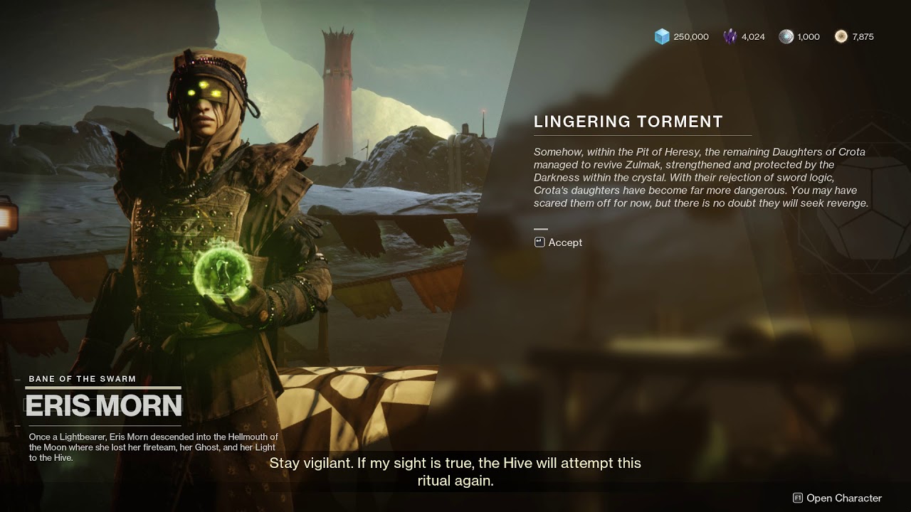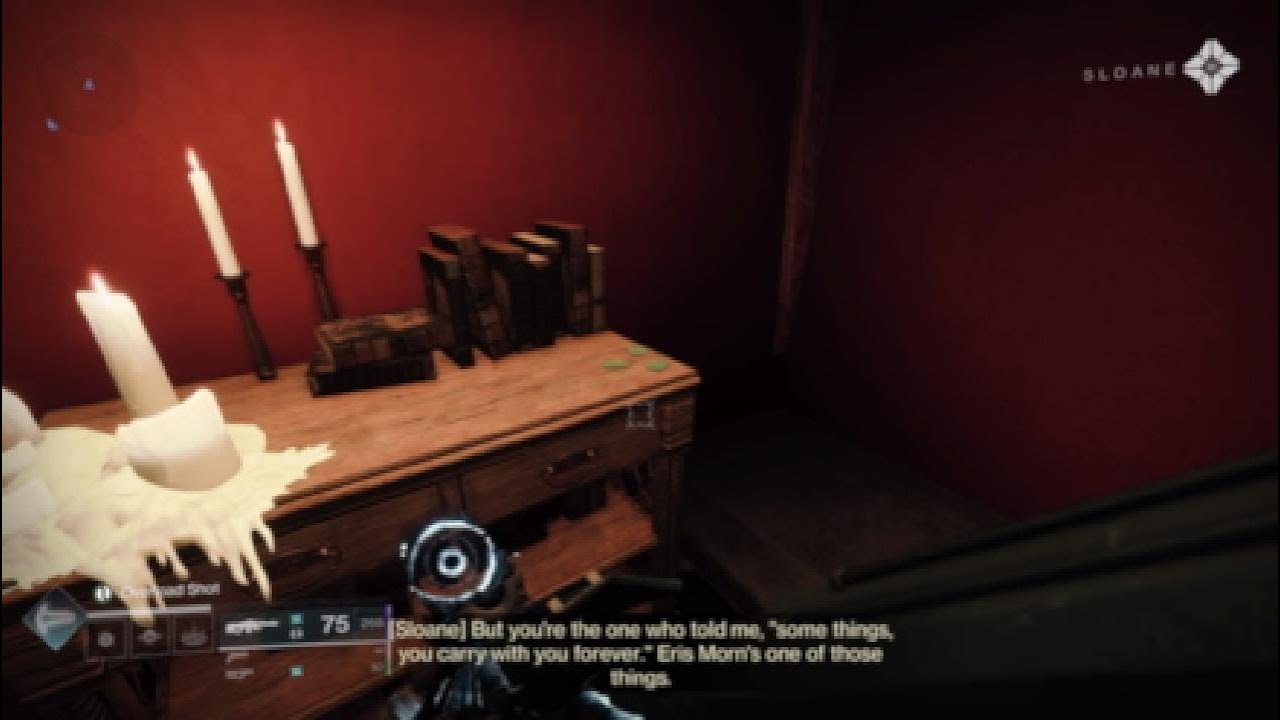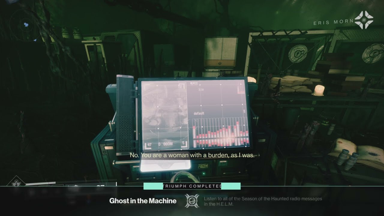 Eris participated in the Great Ahamkara Hunt alongside Guardians such as Wei Ning, Commander Zavala, and Lord Shaxx.34 During the Hunt, Morn wrote to Queen Mara Sov advising her that Ahamkara may flee to Awoken territory to escape slaughter; she encouraged Sov to kill them on sight.5 At some point, Morn came into the possession of an Ahamkara bone.6