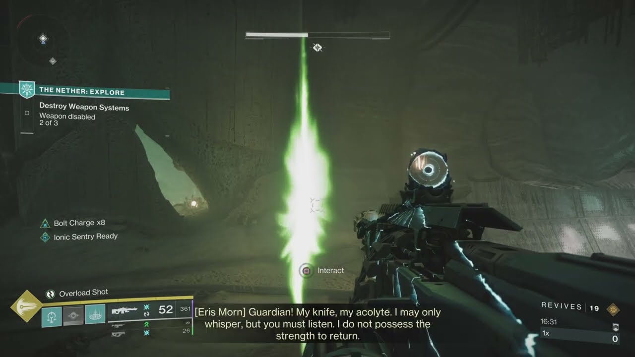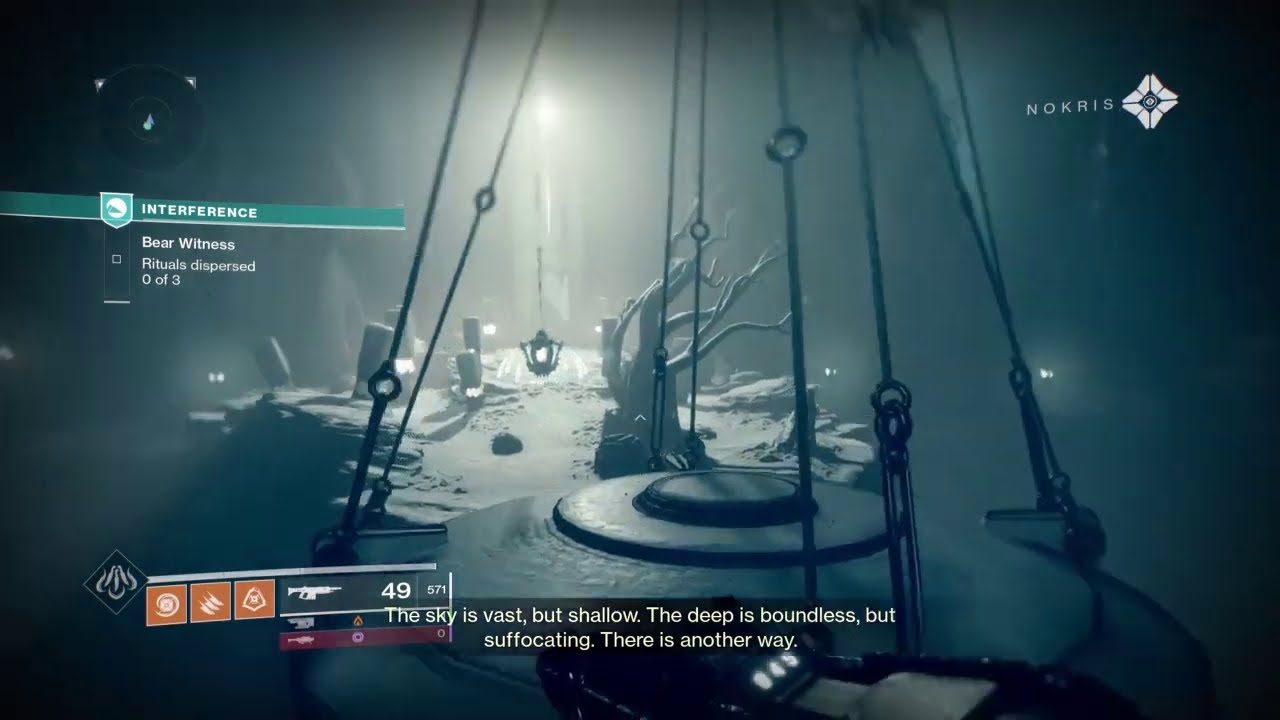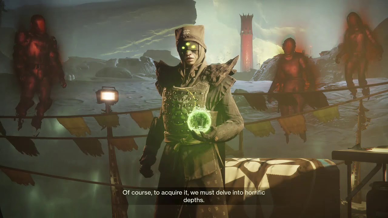 Following the arrival of the Pyramid, Morn made camp on Io. The Pyramid began to transmit messages; however, Savathûn worked to keep the Guardians from being able to understand their contents.37 Morn called on the Guardian to continually retake the Tree and dispel Savathûn’s interference so that she could interpret these messages from the Darkness.38