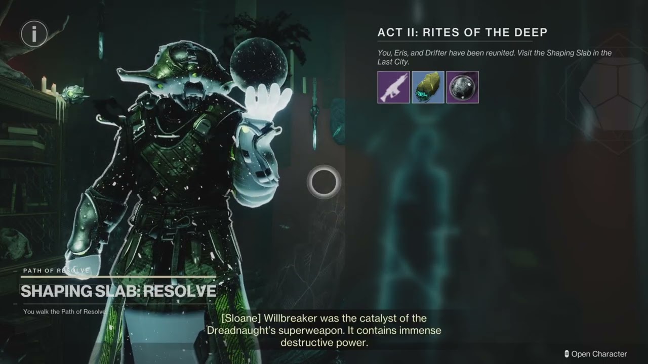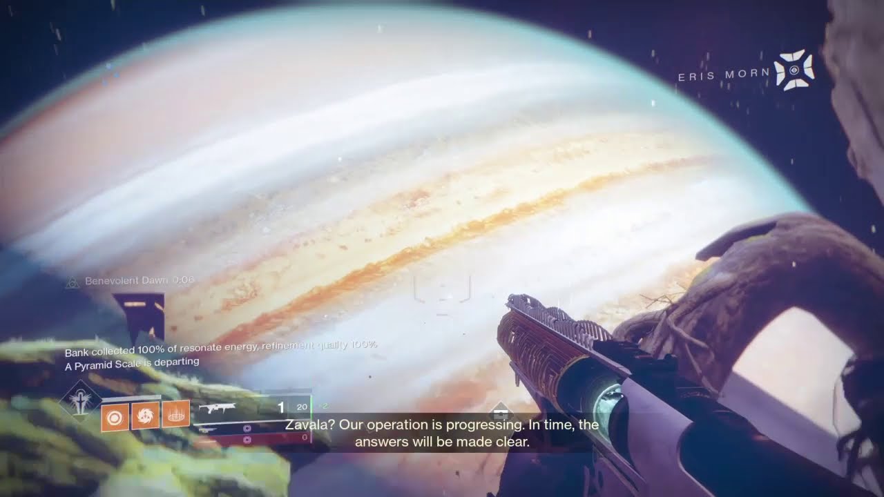 During her stay on Io, Morn discovered something new growing in the Cradle. She determined that it was a gift from the Pyramid and decided to invite Zavala to see it.43 When he arrived, Morn told him of her plan to wield the Pyramid’s gift against it. While Zavala was cautious, he did not forbid her plan. Eris offered the gift to the Guardian, who accepted it.44 The two then used the gift to create the Ruinous Effigy.45