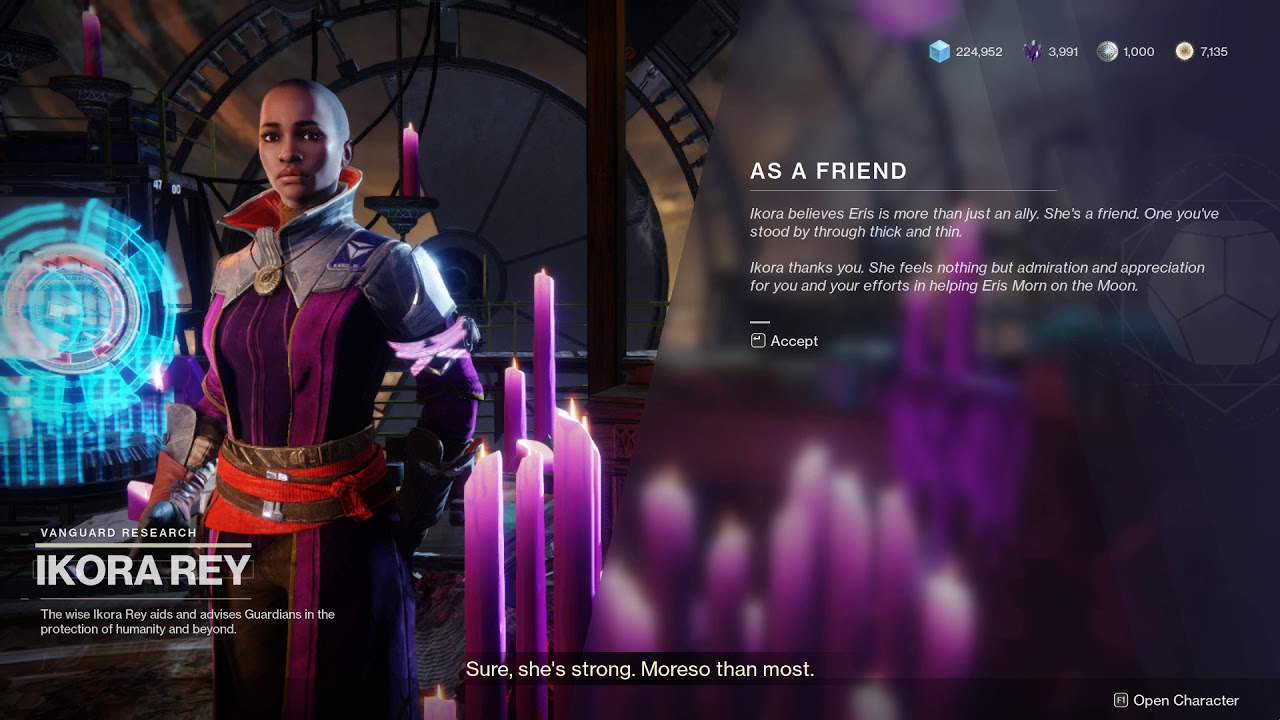 Morn harbored some doubts about the Exo Stranger and the Drifter, fearing that they may fail or deceive the Guardian population.51