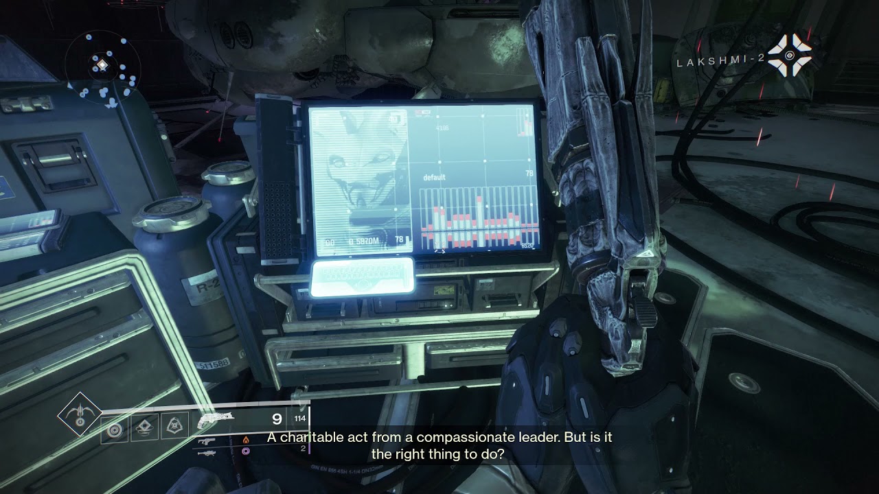 Lakshmi congratulated the Guardian on their victory against Quria, but still believed in a change of leadership even after the end of the Endless Night. Lakshmi believed the City deserves a leader who acts and makes the right choices even if they are unpopular. She wished for the Eliksni and House Light to return to space, where she believed they belong.15